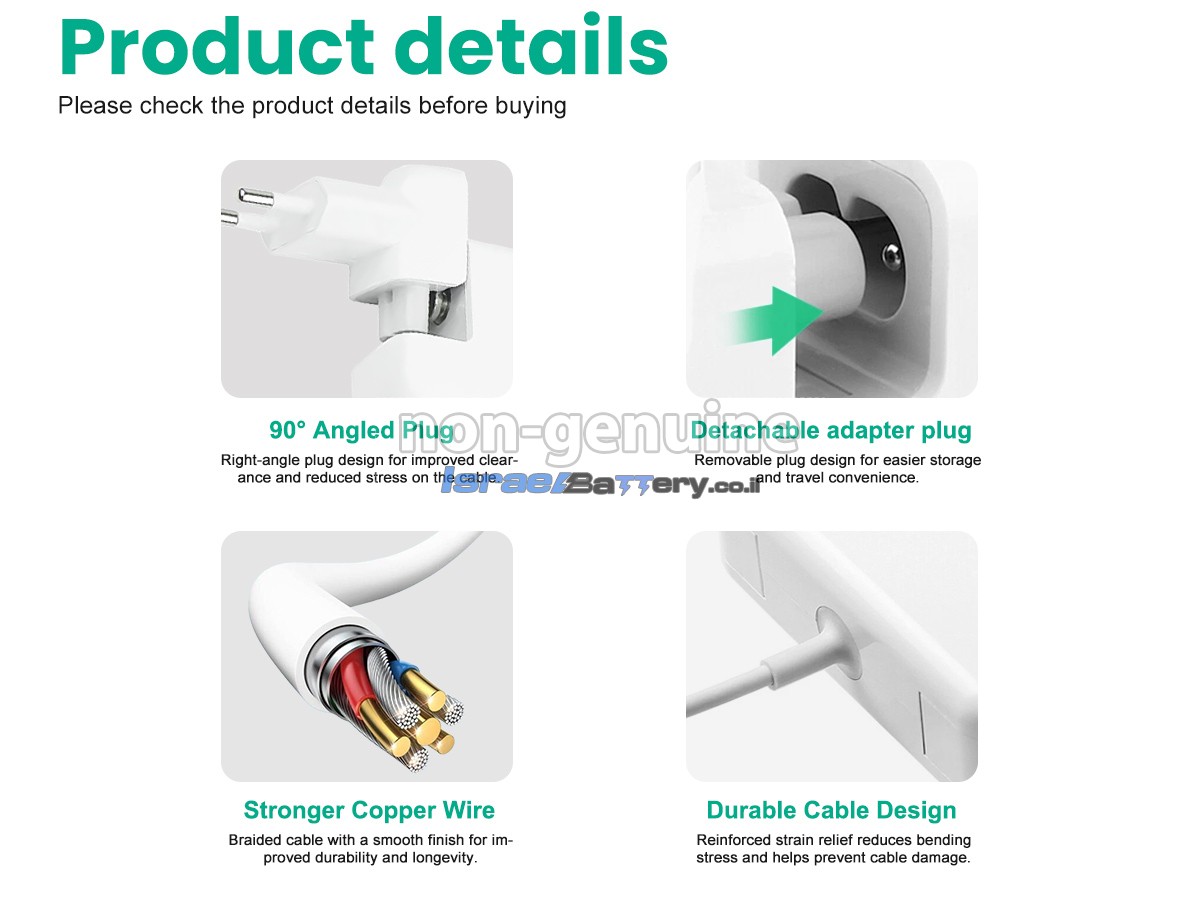 מתאם החשמל החלופי Apple A1502 נבנה בקפידה עם סוללת A+ ברמה עליונה ושבב בקר חכם של TI מתקדם, כדי לספק ביצועים מעולים ומהירות טעינה מהירה. העמידות השתפרה באופן משמעותי, תוחלת החיים ארוכה יותר, מה שמבטיח שהמכשיר שלך תמיד יישאר במצב עבודה מיטבי. מארז המתאם עשוי מחומר סגסוגת ABS+PC עמיד בחום ושחיקה, חזק ומתאים באופן מושלם לדגם המכשיר שלך, ומבטיח התאמה חלקה.
