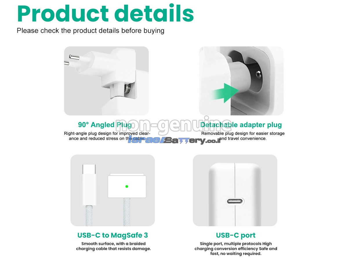 מתאם החשמל החלופי Apple MNEH3LL/A נבנה בקפידה עם סוללת A+ ברמה עליונה ושבב בקר חכם של TI מתקדם, כדי לספק ביצועים מעולים ומהירות טעינה מהירה. העמידות השתפרה באופן משמעותי, תוחלת החיים ארוכה יותר, מה שמבטיח שהמכשיר שלך תמיד יישאר במצב עבודה מיטבי. מארז המתאם עשוי מחומר סגסוגת ABS+PC עמיד בחום ושחיקה, חזק ומתאים באופן מושלם לדגם המכשיר שלך, ומבטיח התאמה חלקה.