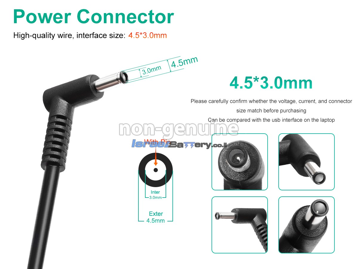 כדי לוודא שהמתאם הזה תואם למכשיר שלך, יש לבדוק אם המתח (V), הזרם (A) וגודל המחבר תואמים את המפרט של המתאם שלנו. בדרך כלל, על המתאם יופיעו פרמטרי היציאה, כגון 20V-12A.