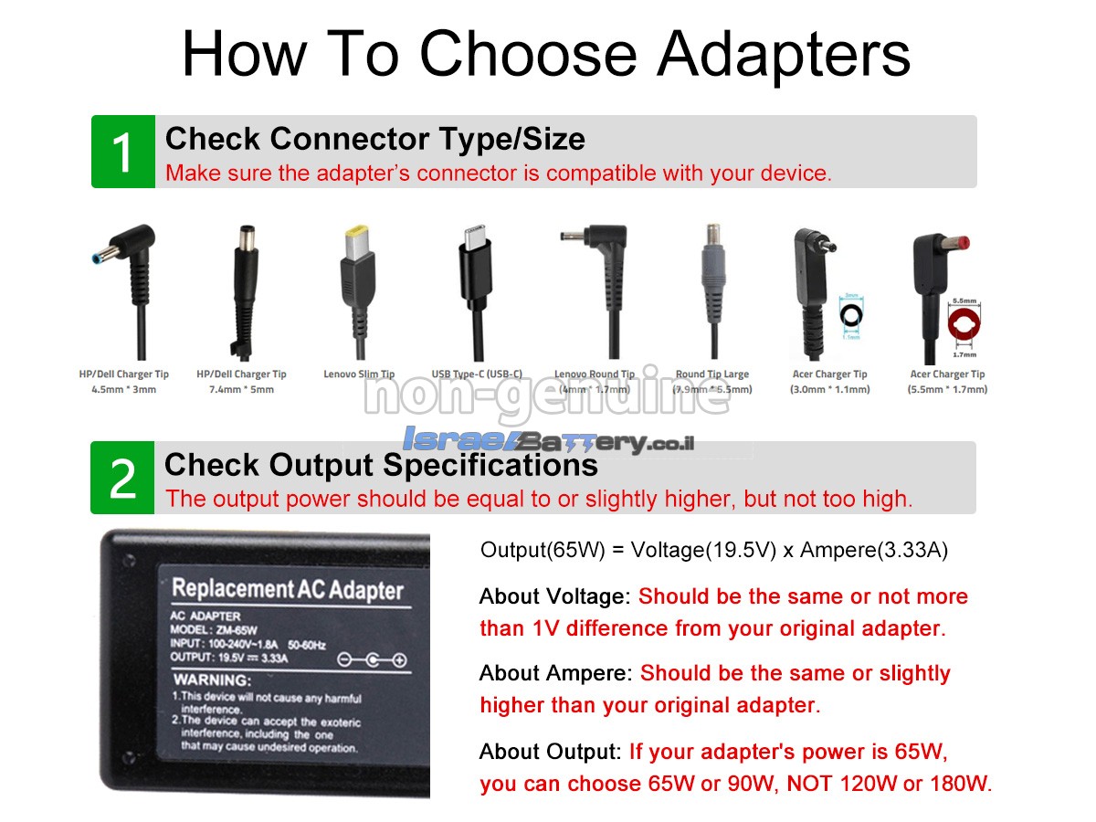כדי לוודא שהמתאם הזה תואם למכשיר שלך, יש לבדוק אם המתח (V), הזרם (A) וגודל המחבר תואמים את המפרט של המתאם שלנו. בדרך כלל, על המתאם יופיעו פרמטרי היציאה, כגון 19.5V-9.23A.