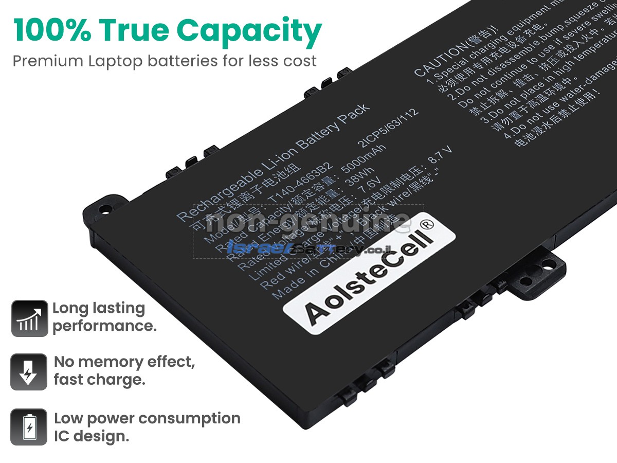 סוללת AolsteCell T140-4663B2 מאמצת תא סוללה מיובא חדש לגמרי, עם איכות אמינה, ביצועים יציבים וחיי שירות ארוכים יותר. בנוסף, סוללה חלופית AolsteCell T140-4663B2 מיוצר ב-1:1 בהתאם לצורת הסוללה המקורית, והוא עשוי מחומרי סגסוגת ABS+PC ידידותיים לסביבה עמידים בפני טמפרטורה גבוהה ועמידים בפני שחיקה, שיכולים להתאים למחשב הנייד שלך 100%.