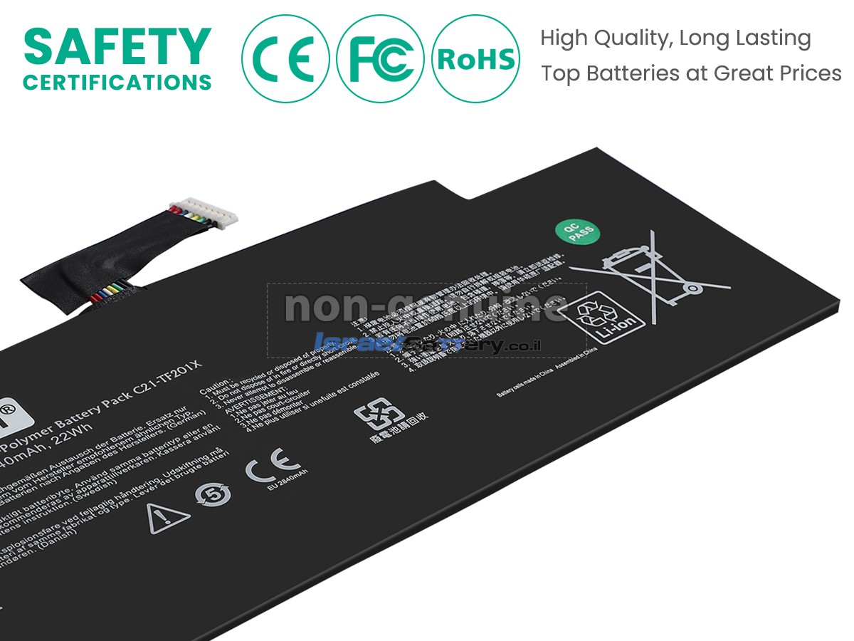 כל הסוללות Asus C21-TF201X שמוצעות למכירה על ידי israelbattery.co.il הן סוללות חלופיות OEM חדשות לחלוטין, ולא סוללות מקוריות. למעשה, הסוללות שלנו משתמשות בתאי סוללה ובמעגלי חכמה מהמותגים הגדולים הזמינים בשוק, והן יכולות אפילו להיות יותר טובות מסוללות המקור. ברכישת סוללות באותה איכות במחיר נמוך יותר, תוכלו לא רק לחסוך בפרמיה של המותג, אלא גם להבטיח את איכות המצבר.