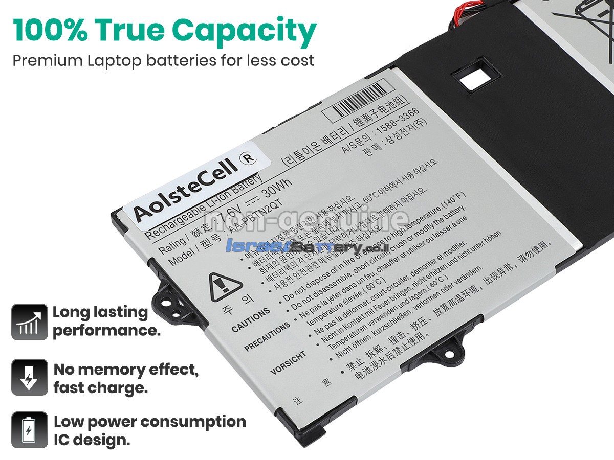 סוללת Samsung AA-PBTN2QT מאמצת תא סוללה מיובא חדש לגמרי, עם איכות אמינה, ביצועים יציבים וחיי שירות ארוכים יותר. בנוסף, סוללה חלופית Samsung AA-PBTN2QT מיוצר ב-1:1 בהתאם לצורת הסוללה המקורית, והוא עשוי מחומרי סגסוגת ABS+PC ידידותיים לסביבה עמידים בפני טמפרטורה גבוהה ועמידים בפני שחיקה, שיכולים להתאים למחשב הנייד שלך 100%.