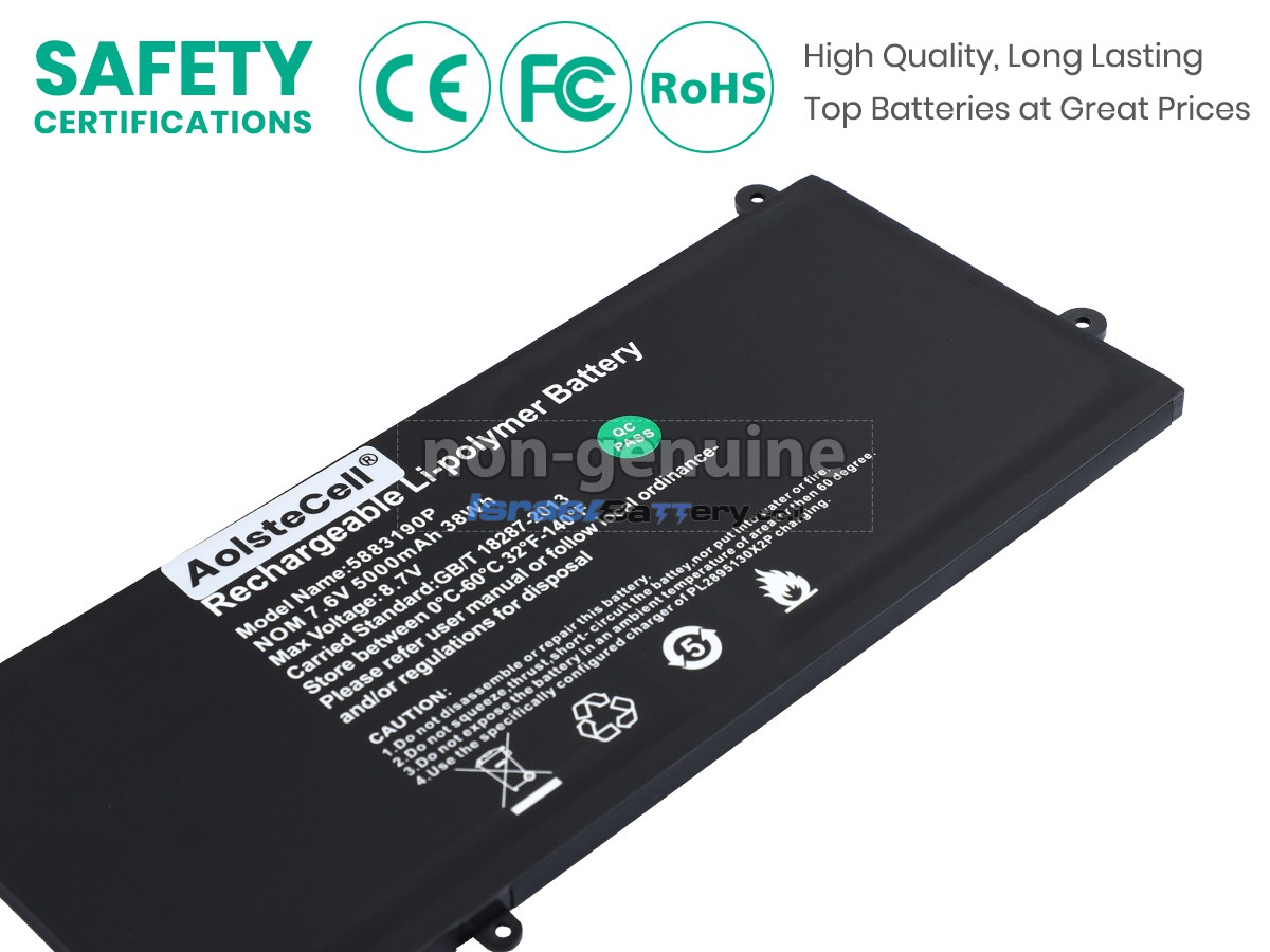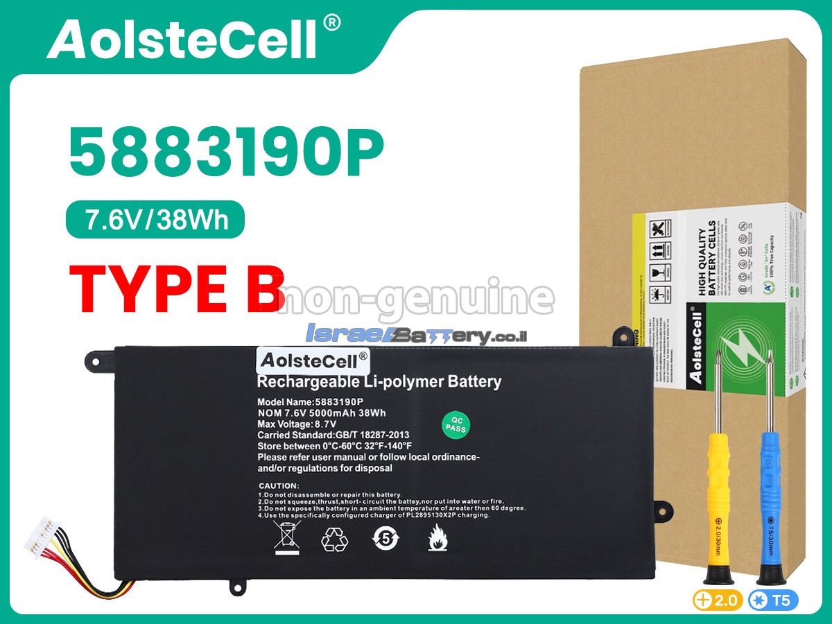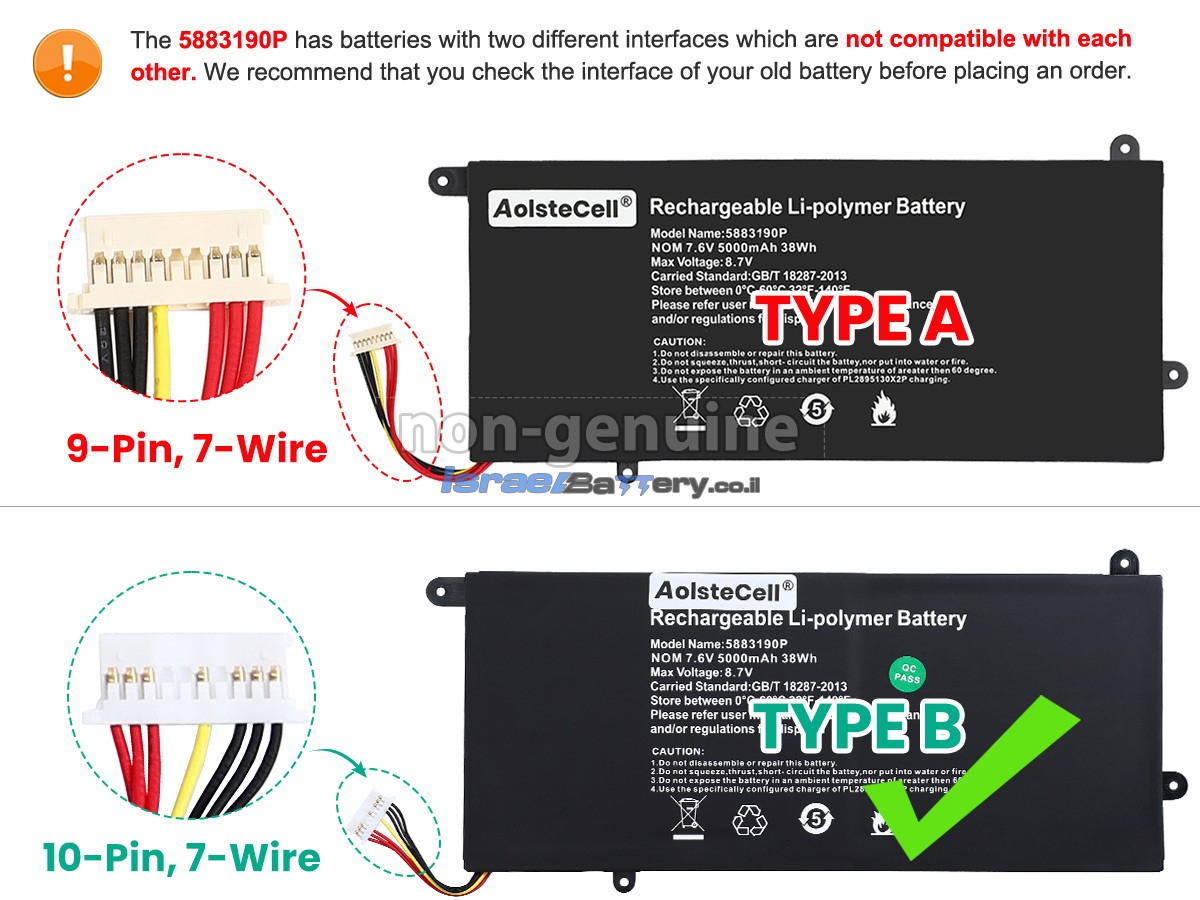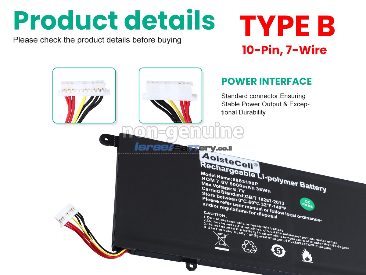 סוללת Vastking 5883190P מאמצת תא סוללה מיובא חדש לגמרי, עם איכות אמינה, ביצועים יציבים וחיי שירות ארוכים יותר. בנוסף, סוללה חלופית Vastking 5883190P מיוצר ב-1:1 בהתאם לצורת הסוללה המקורית, והוא עשוי מחומרי סגסוגת ABS+PC ידידותיים לסביבה עמידים בפני טמפרטורה גבוהה ועמידים בפני שחיקה, שיכולים להתאים למחשב הנייד שלך 100%.